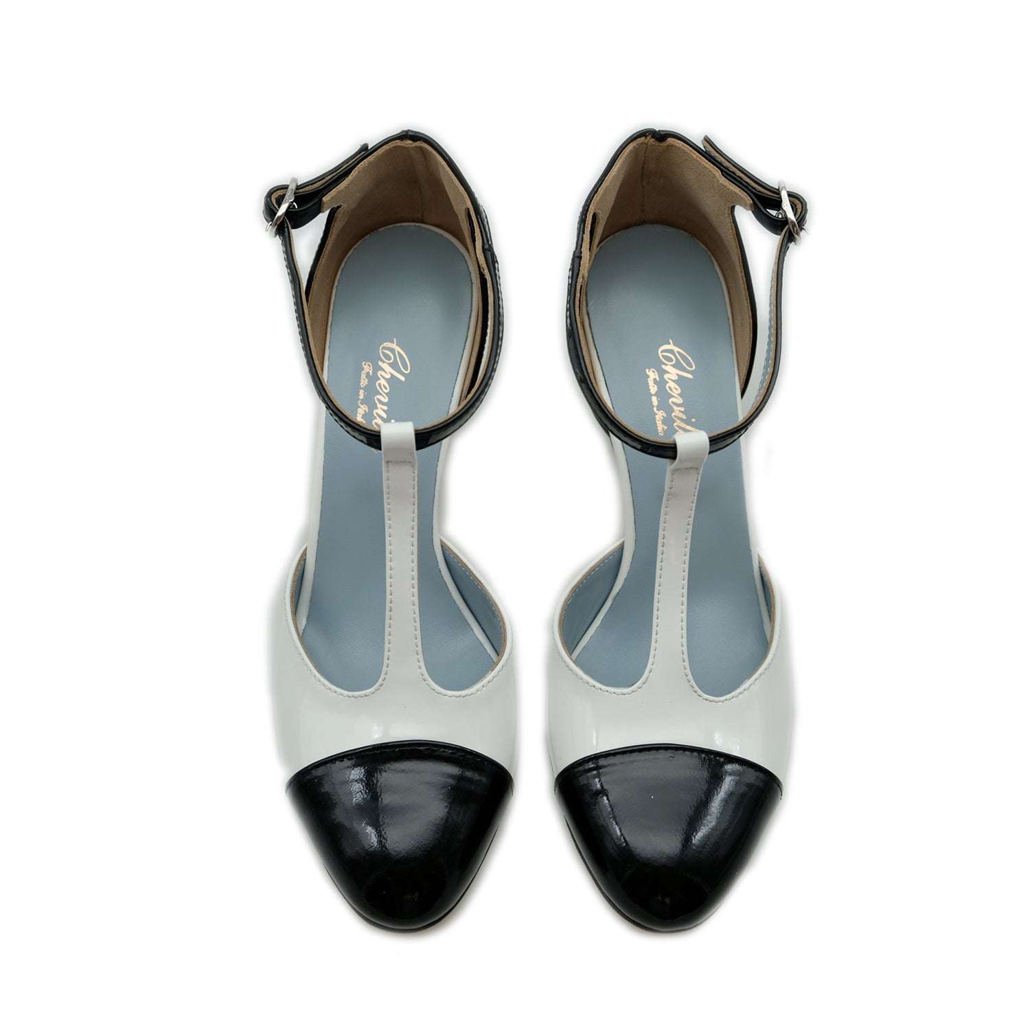 Décolleté tango a punta tonda in pelle verniciata bicolor con T-Bar, cinturino alla caviglia e suola in vero cuoio.