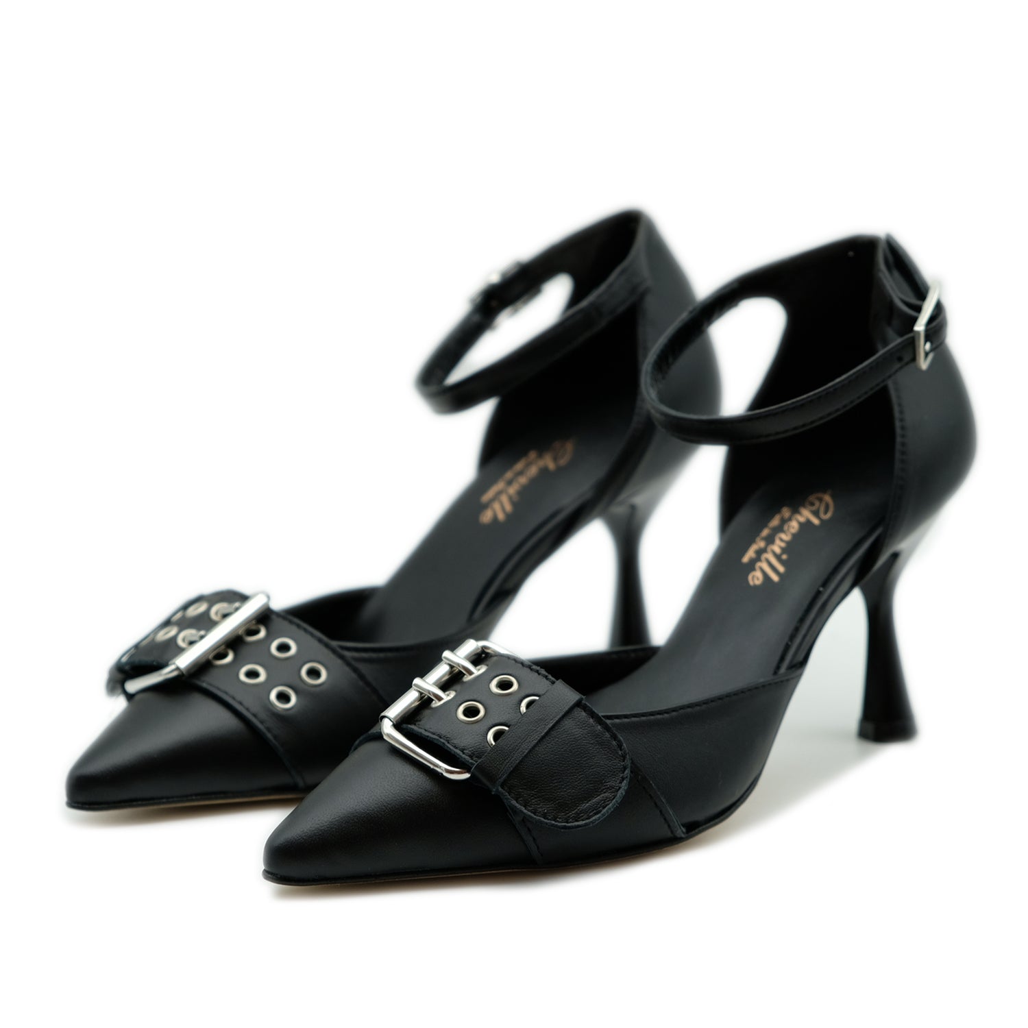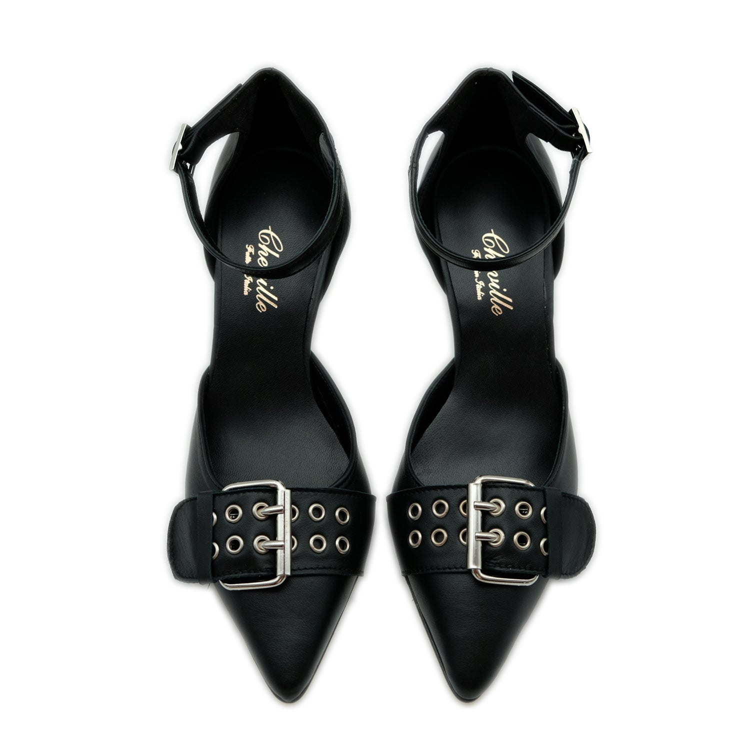 Décolleté a punta in pelle con cinturino alla caviglia e suola in vero cuoio.