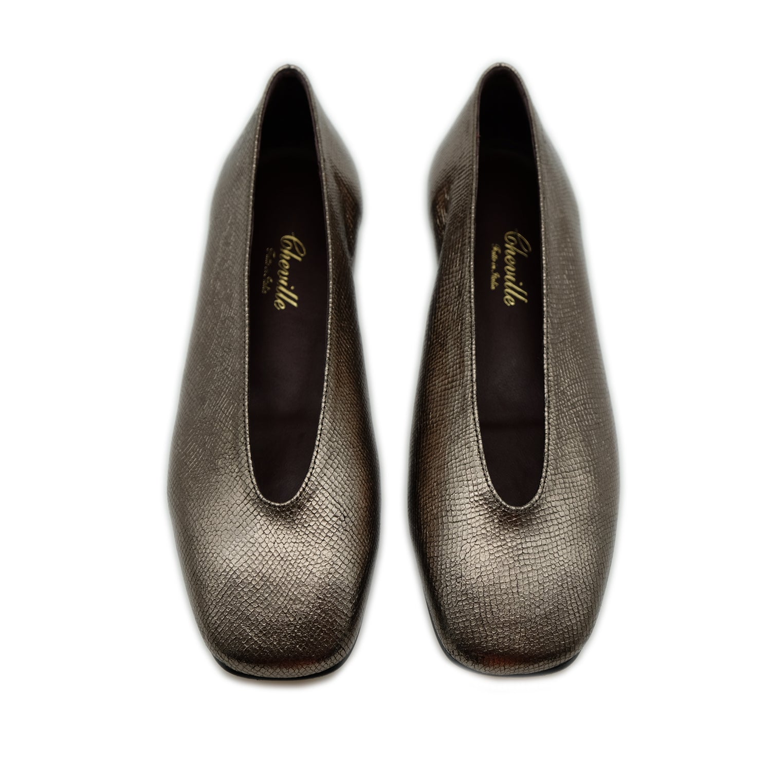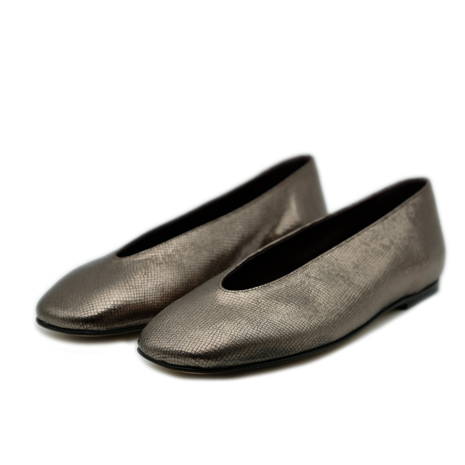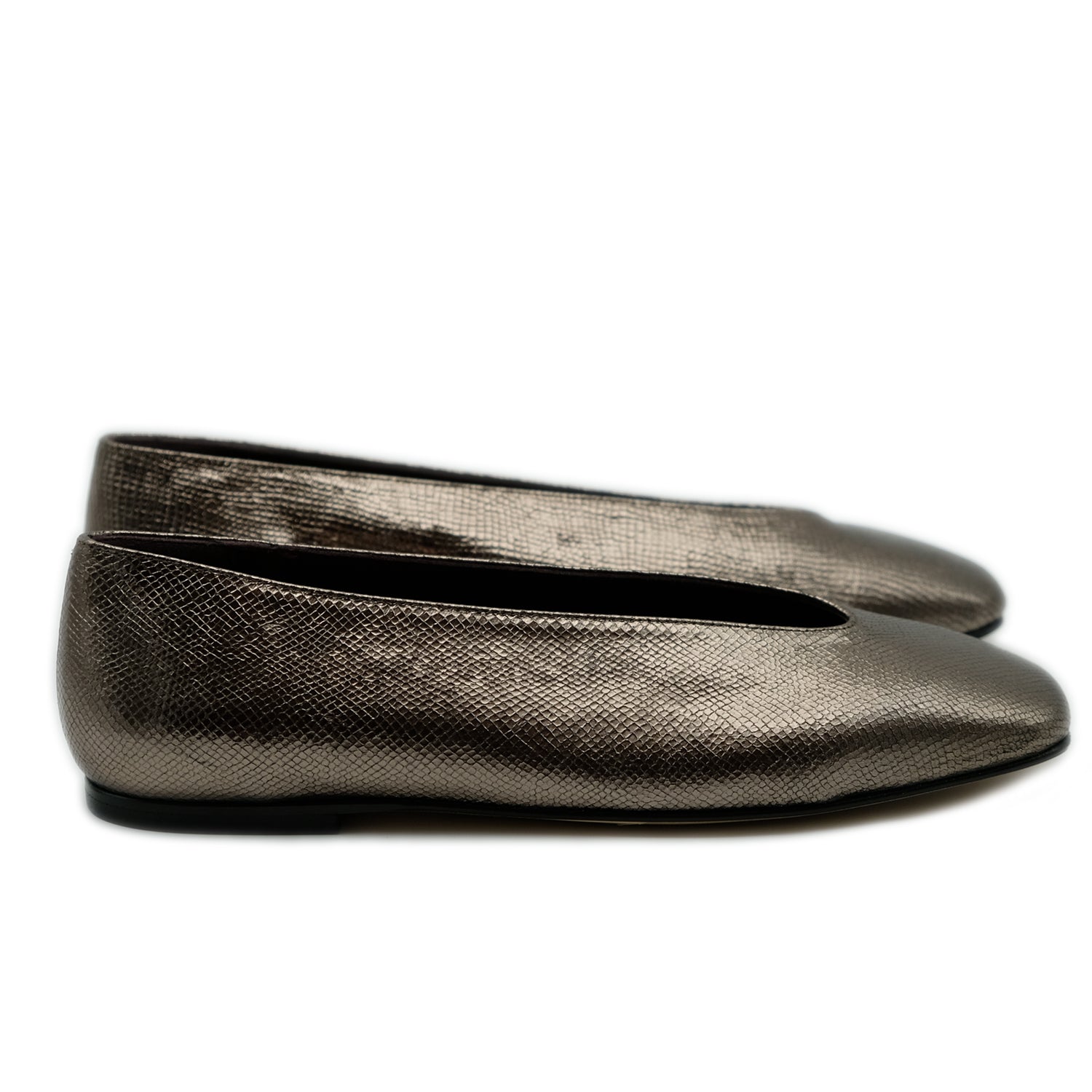 Ballerina a punta quadrata accollata in pelle laminata con suola in vero cuoio.