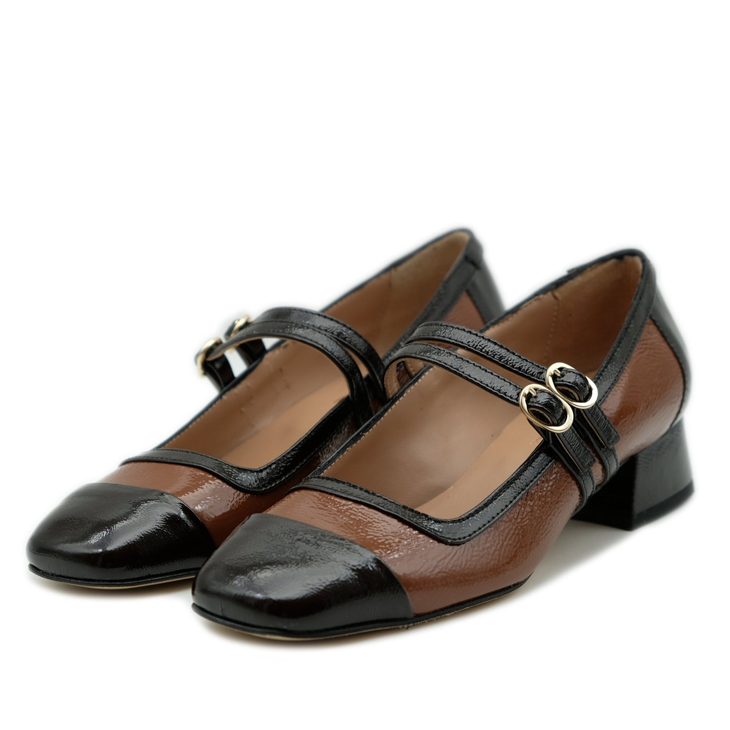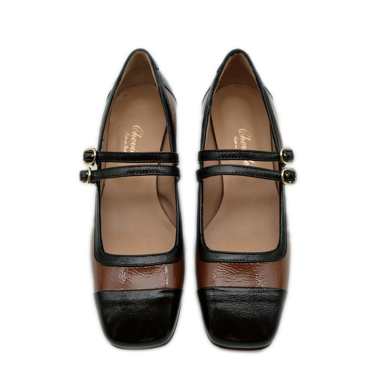 Décolleté mary-jane a punta quadrata in pelle verniciata bicolore con cinturini sul collo del piede e suola in vero cuoio.